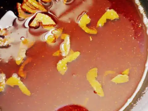 6. Dejar reposar. Esto es para que el pimentón sedimente en el fondo y obtengamos el aceite rojo bien limpio. Rociar los pescados con este líquido. Dejar pasar algunos ajos.
